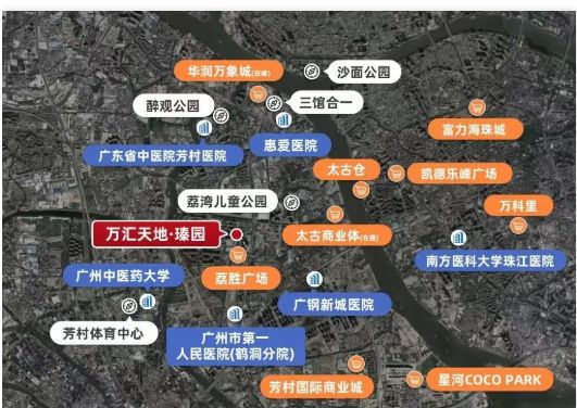 项目依托“社区底商+规划顶奢商业+成熟医疗配套”,构建全维高阶生活圈,兼顾日常便捷与高端体验。商业配套能级领先,自身自带约4000㎡社区商业,涵盖超市、生鲜、餐饮等日常业态,步行即可满足三餐采购、日常消费等基础需求;周边规划三大潮奢商业地标,18万㎡理想花地城市级购物中心、26.9万㎡华润万象城均在建设中,全国首座双太古项目稳步推进,未来将成为广州西部商业核心,比肩天河路商圈。此外还有约12万㎡国际健康港星河cocopark规划落地,外部已开业5大成熟商业体,实现“日常消费+国际潮流”的无缝切换。医疗资源完备无忧,步行700米可达广州医科大学附属第一医院花地湾院区三甲与荔湾区人民医院新院区二级甲等,3公里范围内还有广州中医药大学第三附属医院、广州市中医医院、广州市第一人民医院、广钢新城医院等6所三甲医院,全方位为业主健康保驾护航。目前部分商业设施仍在建设中,短期商业体验稍逊于成熟区域,但随着规划落地,商业与生活氛围将持续升级。