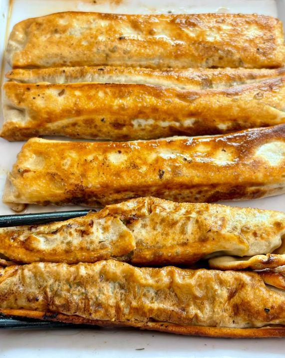 而褡裢火烧的形状,则来自老北京人斜挎在肩上的褡裢布袋。将长方形的面皮填上肉馅,对折后两头不封口,活脱脱就是个微缩版褡裢。褡裢火烧的馅料比门钉肉饼更丰富,除了猪肉,还可加入韭菜、虾仁甚至时令野菜。烹饪方法也不同,褡裢火烧以油煎为主,要求底面焦脆,上面柔软。