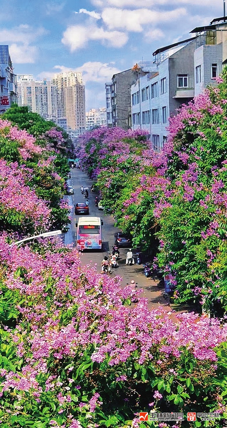 近日,玉林城区教育西路的大叶紫薇迎来盛花期。道路两旁,紫红色的花朵层层叠叠,香气扑鼻,给城市注入了浓浓的诗意与浪漫。