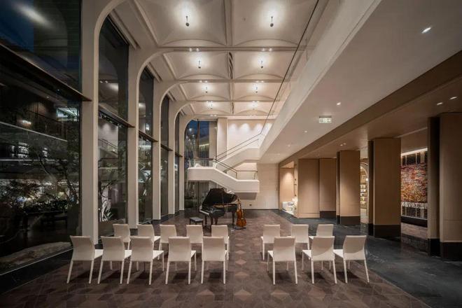 图书馆的连廊外,还串联着一个层高很高的音乐厅,它其实是一个多功能演艺厅,业主们已经在这里组织了好几场演出。它不仅朝向下沉式庭院,更是与地面的架空层一体化设计。