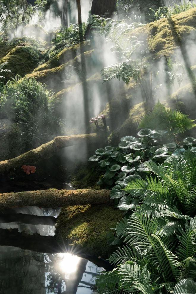当你漫步其中,那种扑面而来的秘境既视感,其实是来源于极其精密的设计。景观设计师精心复刻了山脉的自然走势,打造一片连绵的微型苔原峡谷,让「阳坡」与「阴坡」形成不同的色泽与光影。他们用了两种苔藓,把舒缓的山麓、挺拔的主峰、清晰的山脊线,都浓缩在每一道逶迤起伏之中。